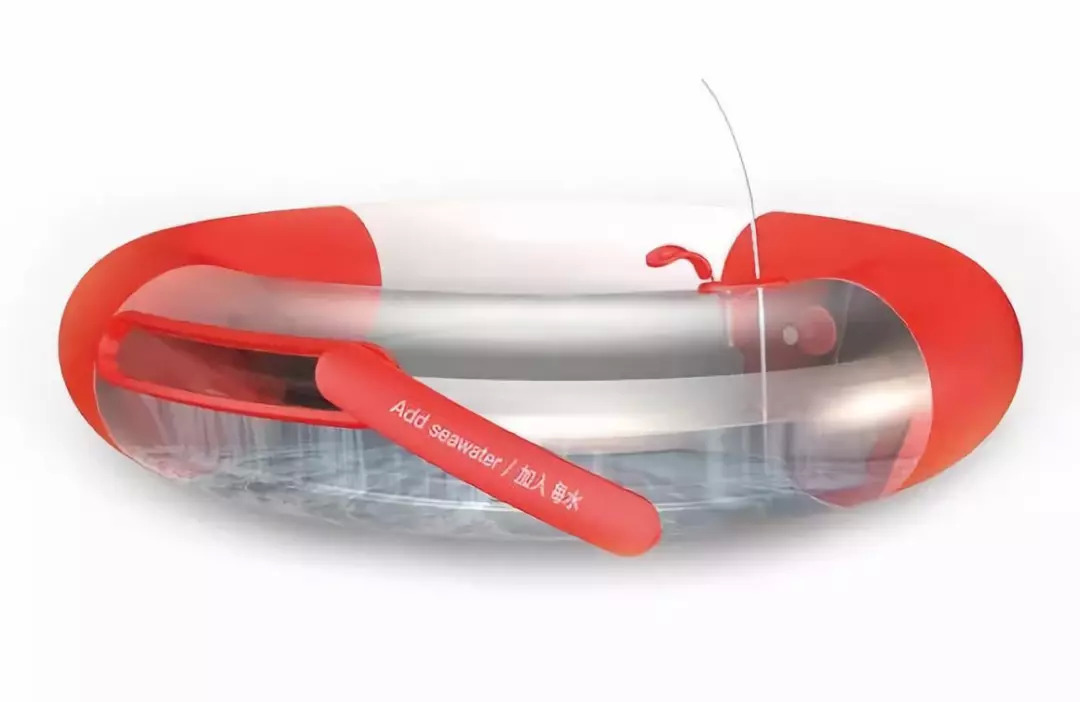 救生圈被分成了上下两层,中间有一段是透明的,落难者可以利用阳光来对灌入救生圈内的部分海水进行蒸馏,并将淡化后的水导入到底层冷凝,再通过吸管饮用。当救援救援迟迟未到,至少可以尽量持久的等待下去。