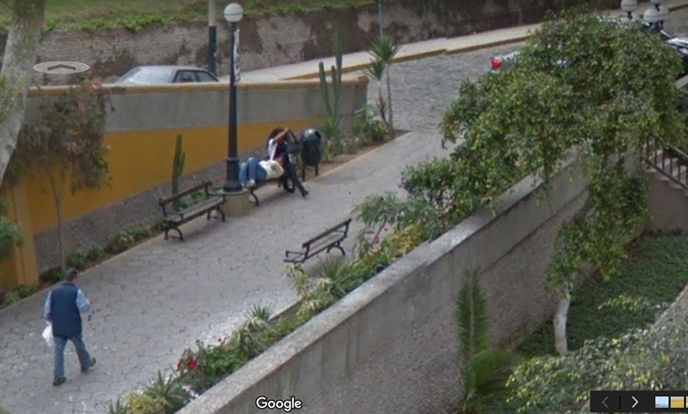 据《镜报》报道,秘鲁利马市一名居民在设定导航路线时,这名男子在3D全景图上看到有一名男子躺在一个长椅上,并且把头枕在一名女子的膝盖上。尽管这对男女的脸已自动被谷歌地图涂抹,但是这名男子从服饰上还是认出了自己的妻子。