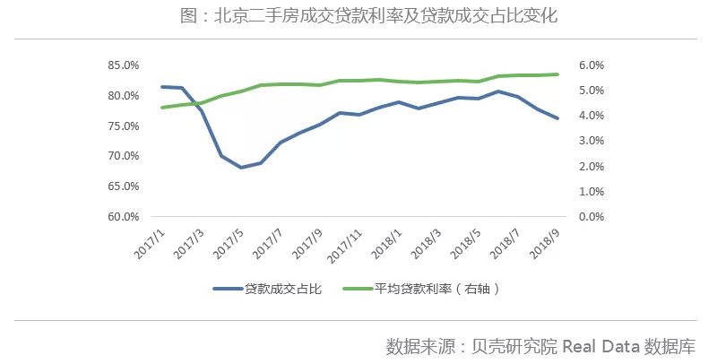 其次,从房贷利率来看,数据显示当前北京二手房购房贷款利率保持在2017年以来的高位,而贷款成交占比降至一年以来的低位,贷款使用程度下降。