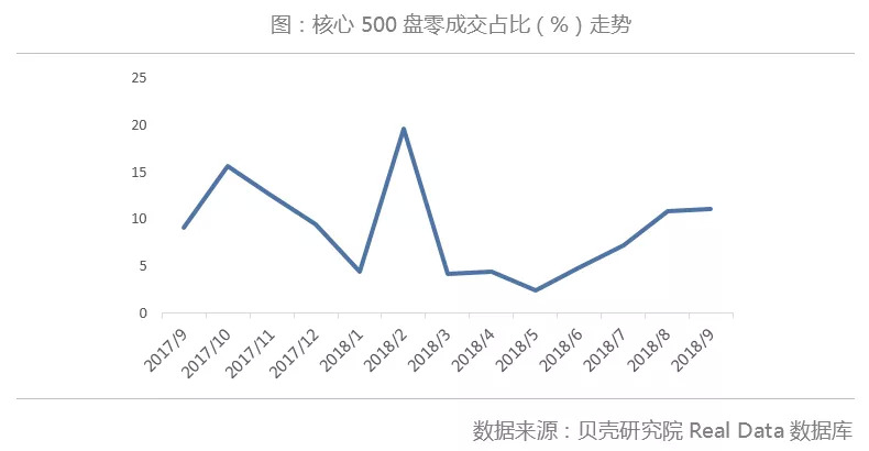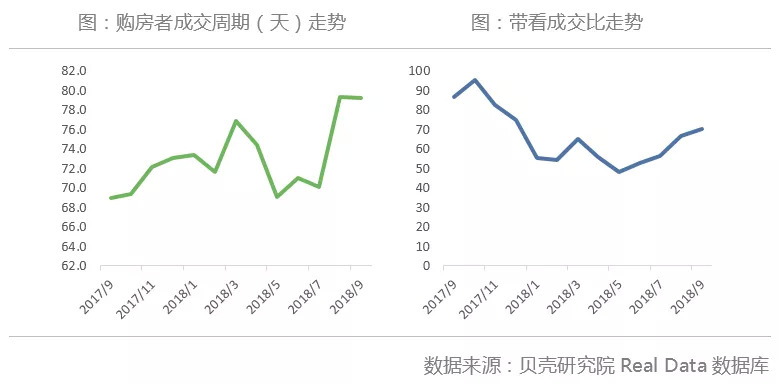 市场成交节奏继续放缓。9月购房者成交周期环比持平,保持在79天的历史峰值处。带看成交比继续上升至70,是2018年月度最大值。业主成交周期68天,处在2016年以来的历史高位上。核心500盘快速成交率继续下探,处在近一年以来的历史低位上。