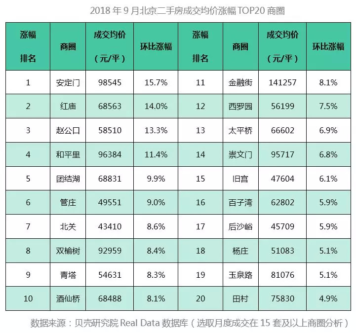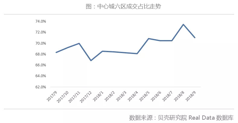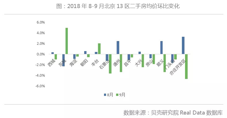 结构性因素致9月均价明显下跌。9月均价结束了前期温和上涨的态势,环比下跌2.2%,均价降至5月水平之下,同比上涨1.1%。均价的下跌一部分原因是由于9月中旬公积金新政导致9月低单价刚需楼盘成交占比上升,均价被结构性拉低。9月13日晚公积金新政发布后当周剩余三天低单价刚需楼盘集中成交,当周中心城六区成交占比环比下滑7.6个百分点,成交均价环比明显下跌5.7%,这使得9月高单价的中心城六区成交占比环比下降2.4个百分点,均价大幅下跌。另一部分原因是由于在市场下行的状态下,均价的确出现了一定程度松动,9月北京13区中有11区均价下跌,较8月明显增多。