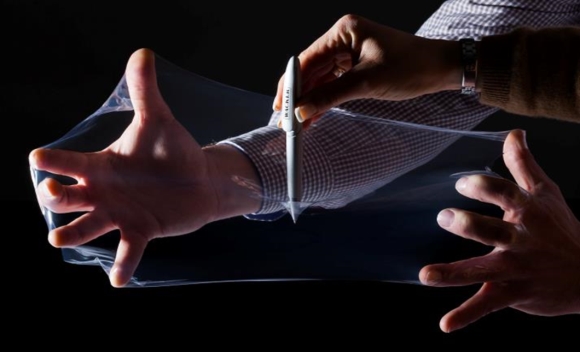 除了3D打印技术,有机硅精密薄膜也是林博多次提到的一款进博会展品。它的厚度最小只有20微米,当表面涂覆电极后,薄膜受外力形变时会产生电流。反之,当薄膜接电后,也会立刻变形。