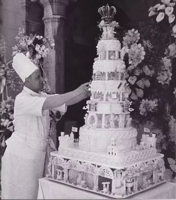 这款6层高的蛋糕绝对是法国创意料理届的经典杰作。放在小桌上比新娘和伴娘都高一头。底层设计为奶油制作的原比例缩小版蒙特卡洛皇宫,往上每一层都装饰有奶油绘制的摩纳哥历史代表文物,最顶层则是用纯冰雕刻成的王冠。