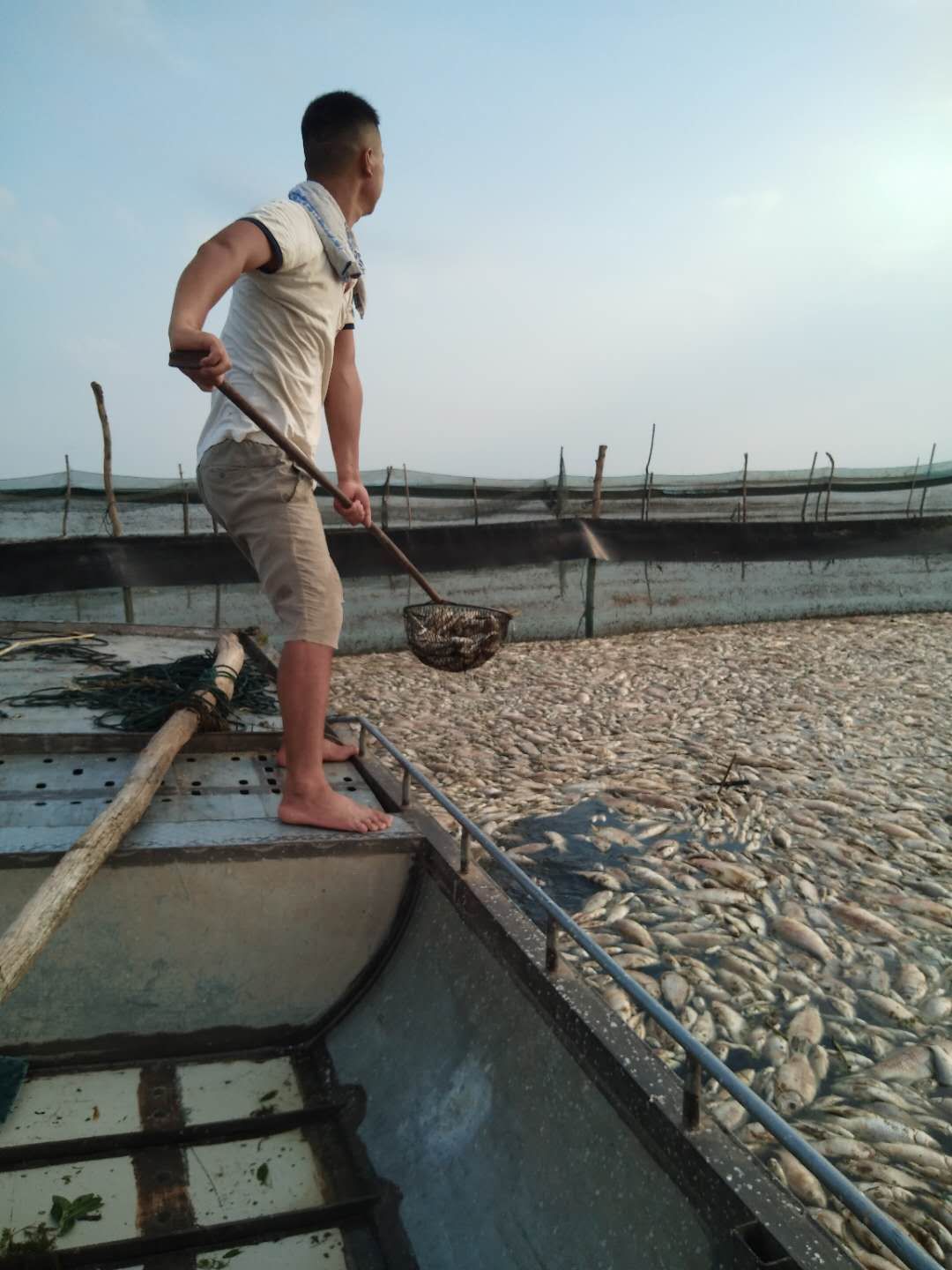 同样在新集村围网养殖的赵全友在短视频平台上发了十几条状态,依然可见当时情景:水是黑色的,鱼全部翻了过来,漂浮在水面上,密密麻麻。赵全友给视频打上标签,“投资了几十万的鱼苗,全部爆掉。”