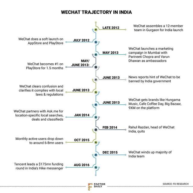 在2015年中期,微信意识到他们在印度走进了死胡同。大约一年后,腾讯于2016年8月主导了Hike的一次1亿7500万美元的融资,促使Hike的估值达到了14亿美元。但是,Hike依然在变现的路上苦苦挣扎,在两年后的今天,它的用户数量也仅有1亿左右。