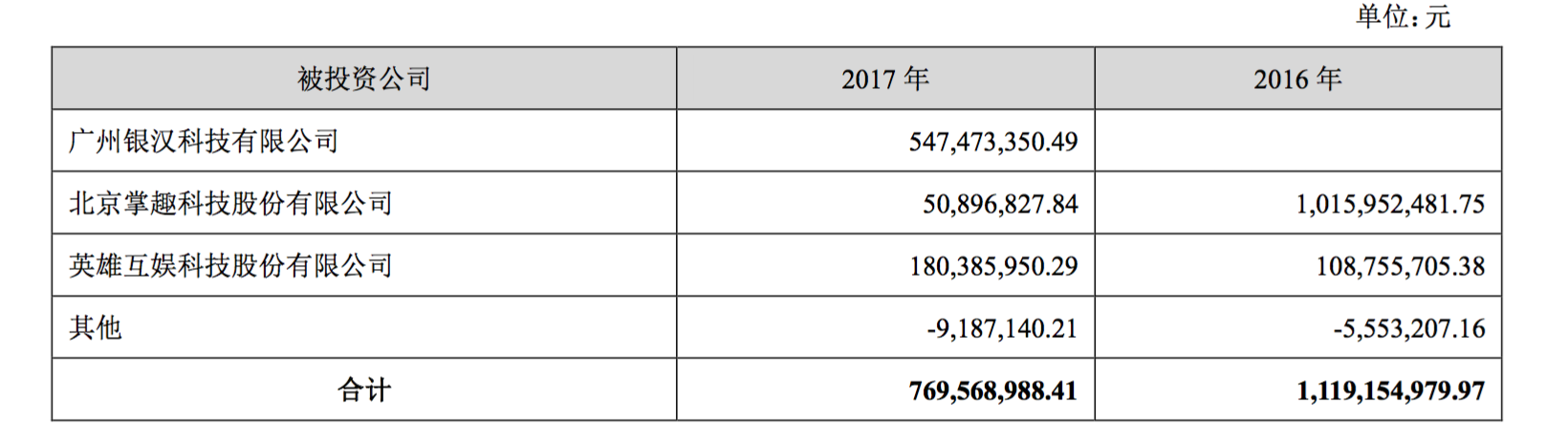截至2017年年底,华谊兄弟已清仓掌趣科技。Wind数据显示,华谊兄弟目前持有银汉科技25%股份。此外,还有2015年底时华谊兄弟以19亿元收购的英雄互娱20%股份,2018年上半年,英雄互娱带来的投资收益有4723.58万元。