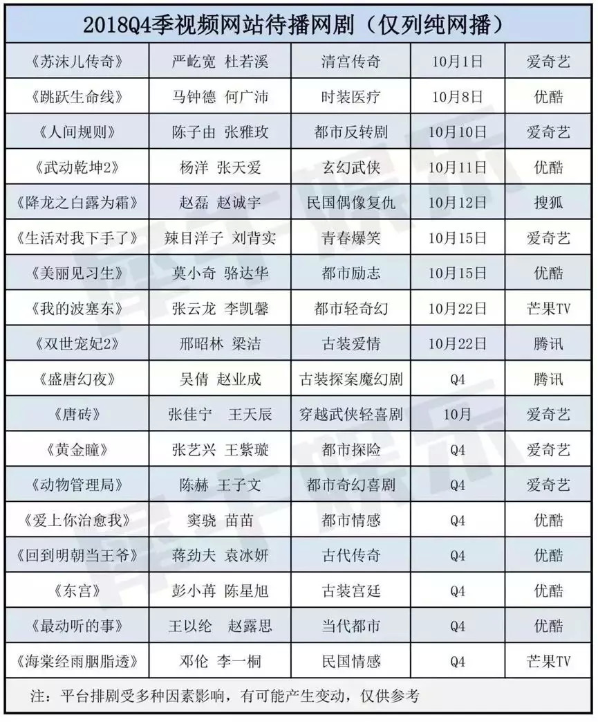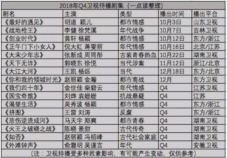 一点剧读(ID:yidianjd)根据当前“新信息”,简单梳理出一份Q4剧集待播片单。不难发现,在接下来的剧集市场当中,古装剧“隐退”、卫视献礼剧“挑大梁”,而一向不按常理出牌的视频网站,将迎来多部“剧二代”。