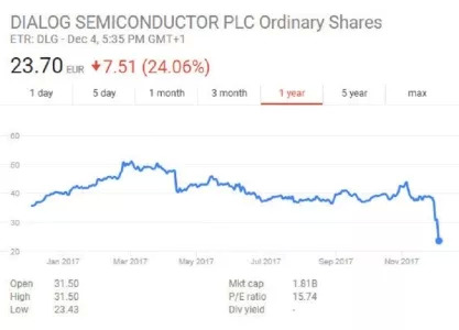 2017年12月,苹果被证实正在进行电源管理芯片自研,并且早在四月份的时候就已经组建起了一只大约八十人的研发团队,直接引发Dialog股价跌幅高达24%。