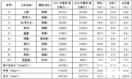▲ Gartner 2017年世界半导体产业前十大企业营收规模及增长表