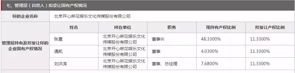 目前,按照股权优先受让协议,开心麻花的三位持股管理层张晨、遇凯、刘洪涛均拟受让国企二股东转让的全部股权;另一方面,按照国有控股企业出售资产的规定,此次股权转让必须在产权交易所进行公开挂牌和转让。