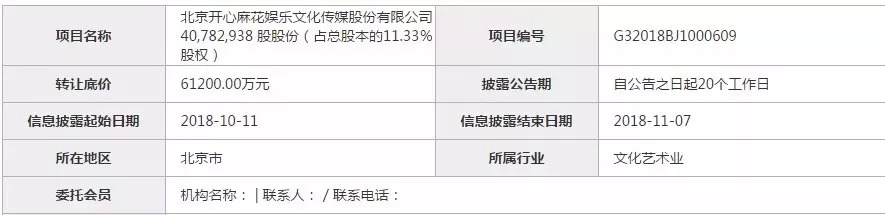 10月10日,北京产权交易所挂出一则转让信息,开心麻花第二大股东——中国文化产业投资基金(有限合伙),挂牌转让其所持有的开心麻花11.33%股权,转让底价为6.12亿元。