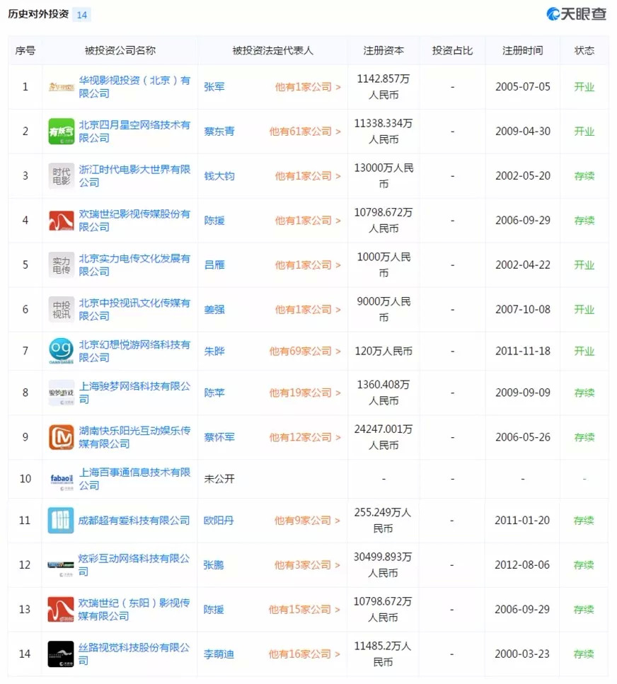 根据天眼查的公开资料显示,中文产业光在影视文娱板块的对外投资公司就有华视影视、欢瑞世纪、湖南快乐阳光、上海百事通、浙江时代电影、北京中投视讯等业内多家知名影视公司。
