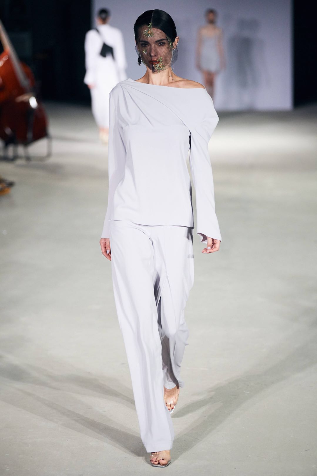 可以看出YIRANTIAN的设计是非常实穿的,设计不夸张却也不乏巧思。例如裤腿处的倒三角褶皱和连衣裙胸前松垮的系带,西装上的双层口袋远看十分隐形,近看才能发现其中的巧妙。色彩的搭配通常也是顺畅且有质感的。这一季的鞋款比较丰富,尖方头、PVC和皮质均有出现。