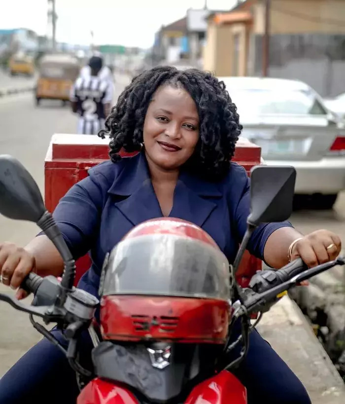 Temie 骑在 LifeBank 的摩托车上