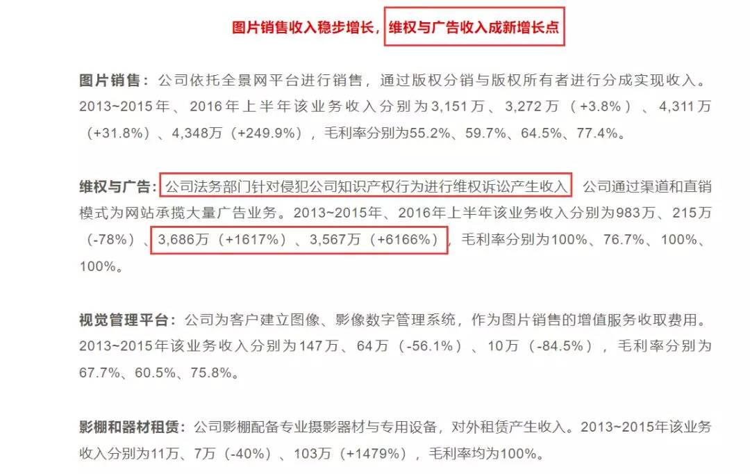 报告显示,全景网络公司法务部门针对侵犯公司知识产权行为进行维权诉讼产生收入,通过渠道和直销模式为网站承揽大量广告业务,这项收入在2015年和2016年上半年分别达到3688万和3567万,毛利率都是100%,最高增幅达到6166%。