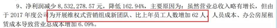 数据这么好看,那自然要再接再厉。在2017年的公司年报里,公司公开讲,为了开展维权式营销组成新团队、比上年员工增加了62人,由此导致人员、房屋租赁等营业总成本增加6.09%。