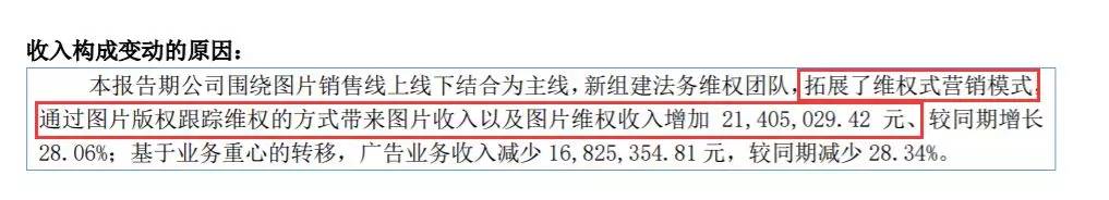 当然,“维权式营销模式”立刻带来了丰厚的回报,财报显示图片维权收入增加了2100多万。可以说是“维权式营销模式”人多力量大的写照了。