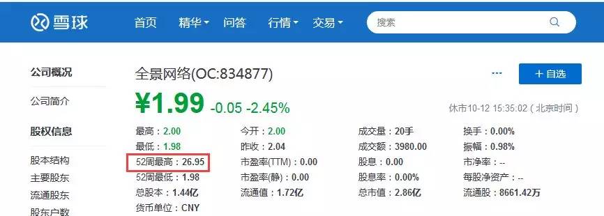 全景网络的股价从2016年5月27日的最高价26.95元/股跌到2018年10月12日的1.99元/股,市值也仅剩下不到3个亿,跌去了90%。