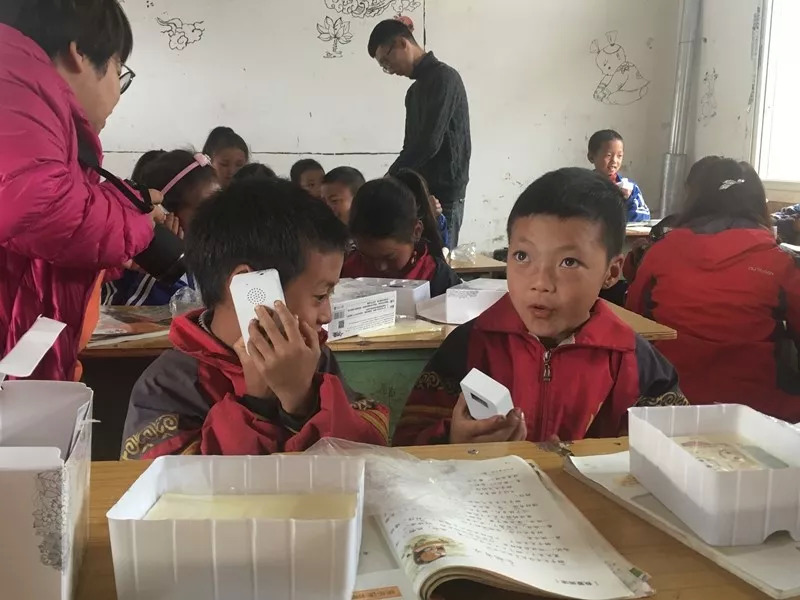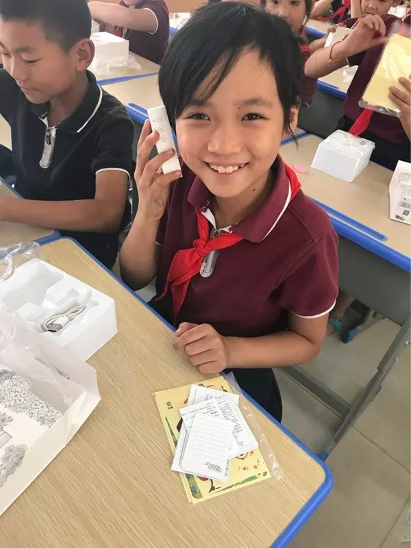 ▲2018年9月10日,湖北彭家沟小学,孩子们收到故事盒子后非常高兴。那天是教师节,一个孩子把自己的盒子包装好,送给自己的老师,说:老师,你每天很忙,很累,有了这个盒子,你晚上就可以听着它讲的故事睡觉了