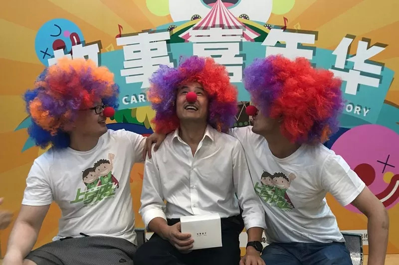 ▲ 2018 年六一前,上学路上邀请100位各界名人录制365个自信故事,制成新版故事盒子,这个活动就是“故事嘉年华”。所有嘉宾和工作人员都会扮成小丑。而刘新宇每次到学校里去见那些孩子,则会把自己变成一个“杂耍艺人”,这样他就可以在非常短的时间内让这些平时缺少关注和温暖的孩子们笑起来。他说,这是对他最大的激励、最大的回报
