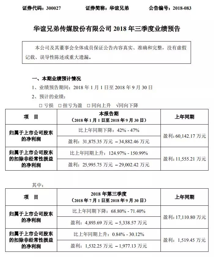 10月12日晚间,华谊兄弟发布了2018年前三季度业绩预告。