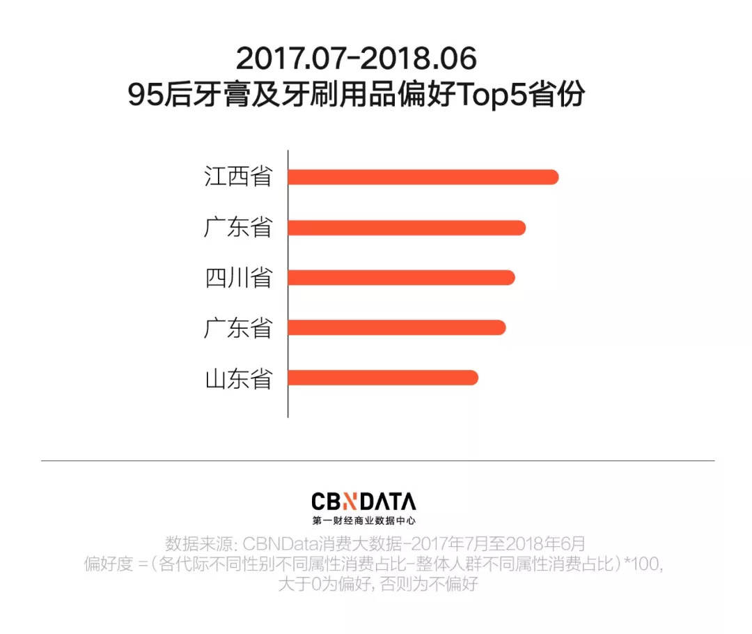 其中,95后妹子们在线上牙膏及牙刷用品上的剁手热情,不仅远超95后汉子,且相较于整体女同胞更显领“刷”的女子力。此外,从地域偏好来看,江西省的95后们护齿意识较高。