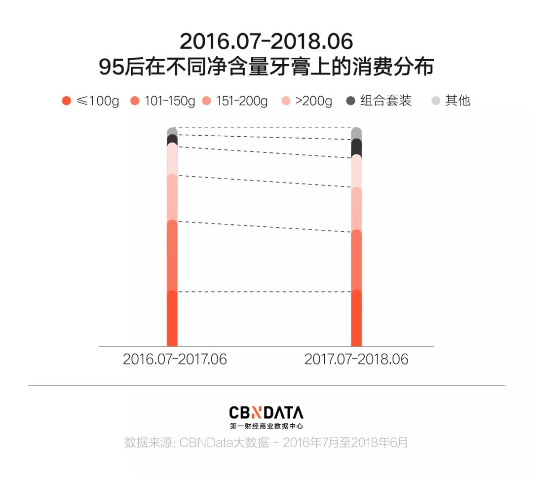 “你有freestyle吗”都已是陈年老梗,善变95后们的牙膏shopping观,自然也要有所“刷”新。相较于上一年同期,95后们为牙膏组合套装分配了更多的金力份额,且相比之下,对不同净含量的单支牙膏日渐不感冒。其中,95后的小男生尤其偏爱牙膏的组合套装。
