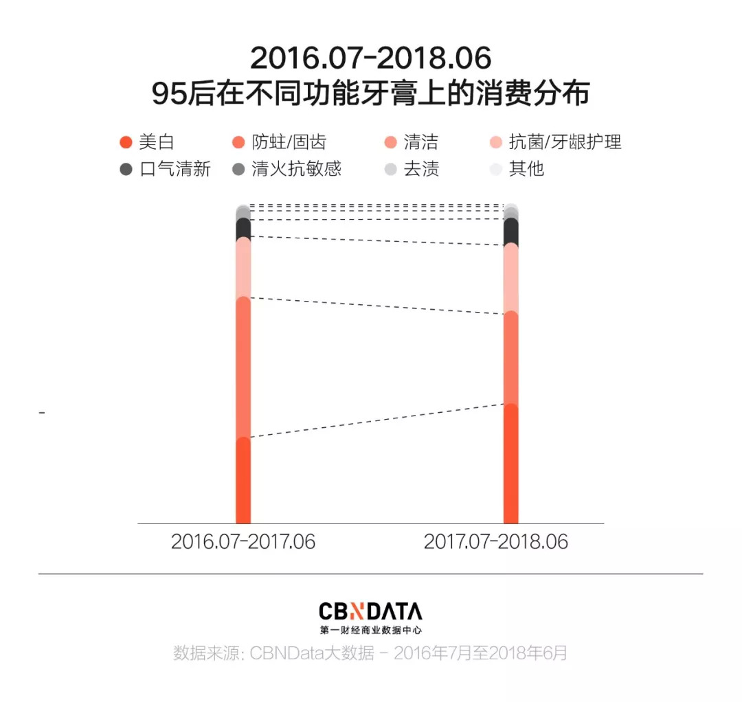 在“颜值为王”时代熏陶之下,95后们也瞬间领悟到面子工程中牙齿的重要性。以至于95后们在不同功能牙膏上的支出分布,在近一年有了显著的“金力”转移,曾经对“防蛀固齿”牙膏的大投入,如今都转到了“美白”牙膏上。而“迁徙”大流中,95后妹子们尤为积极,看来“牙齿美白”是她们的当务之急。