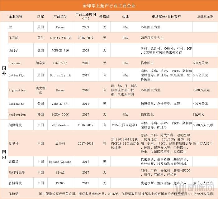 从全球来看,以GPS为首的传统医疗器械巨头企业领跑掌上超声市场,最早的从2009年就已开始布局。GE公司生产的第一代掌上超声VSCAN 1.0在美国上市时,曾引起轰动,分别被美国《时代周刊》和知名科普杂志《科技新时代》评为“2009年50项最佳发明”和“2010年100项最佳科技成果”。