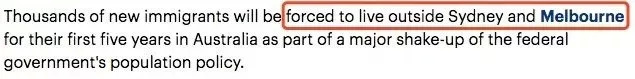 而是主要针对那些并不附属于特定的地理位置的45%的签证类型(189/190/489等)。澳洲政府会给这些签证配备一些“鼓励和附加条件相结合”的政策,让移民去政府想让他们去的地方。