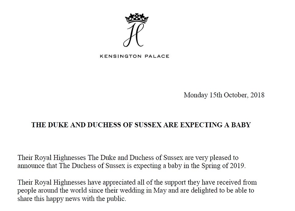 肯辛顿宫声明表示:“萨塞克斯公爵(即哈里王子的封号)及夫人非常高兴地宣布,两人将在2019年春天迎接新生儿的诞生。两位殿下感谢自5月份结婚以来从世界各地得到的所有支持,并很高兴能够与公众分享这一喜讯。”