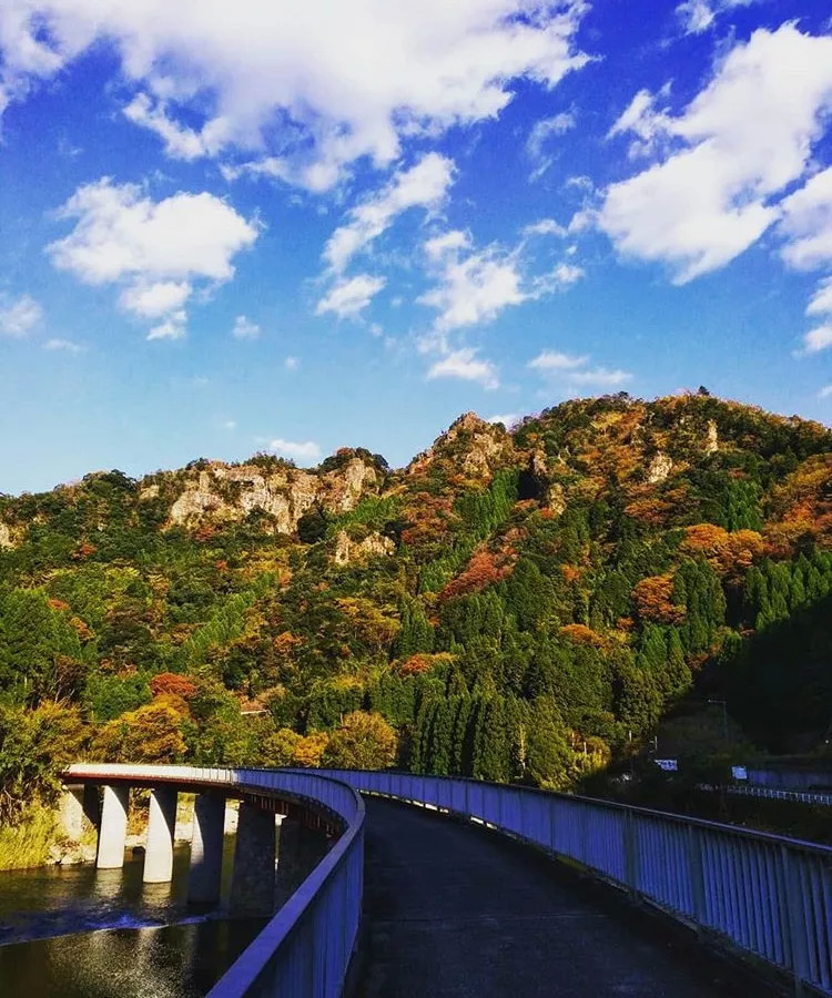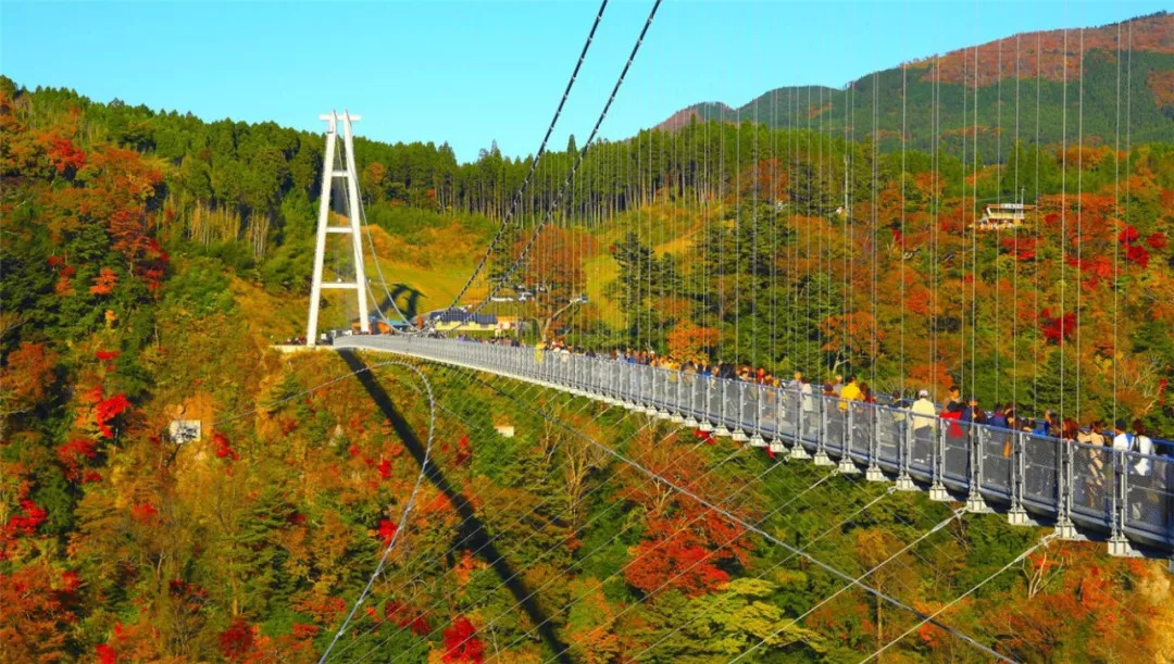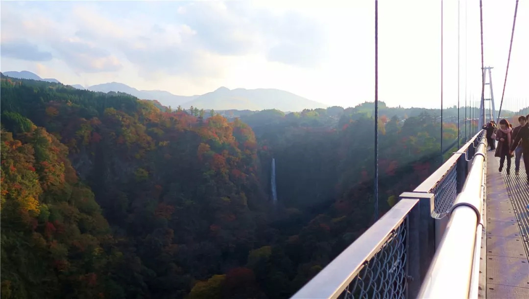 站在这座日本最高且最长的人行天桥上,你能透过桥面板中部的钢格栅俯瞰谷底溪流,或是环顾四周绵延不绝的醉人枫景,甚至远眺位列“日本瀑布百选”之一的震动瀑布。