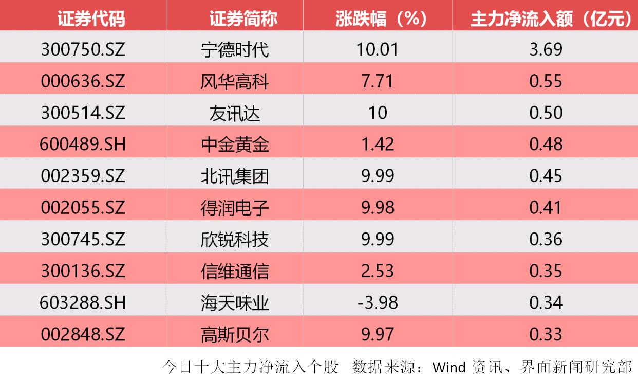个股表现上看,除去未开板新股,沪深两市仅有1只个股主力净流入额超过1亿元。公司三季度净利同比预增近一倍,宁德时代(300750.SZ)一枝独秀,实现3.69亿元主力资金流入。风华高科(000636.SZ)、友讯达(300514.SZ)分别吸引0.55亿元、0.50亿元主力资金流入。海航投资(000616.SZ)前三季度净利预增约72倍快速涨停。