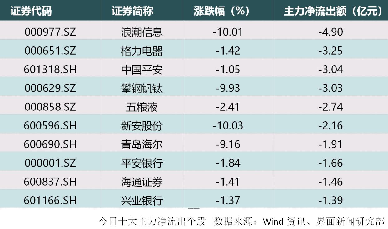 沪深两市共计17只个股主力资金净流出额超1亿元。浪潮信息(000977.SZ)遭遇4.90亿元主力资金流出跌停;格力电器(000651.SZ)、中国平安(601318.SH)分别遭遇3.25亿元、3.04亿元主力资金流出。新安股份(600596.SH)主力资金流出规模达2.16亿元跌停。