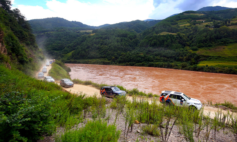 在滇藏线上山体滑坡是经常能够见到的,盘山而建的双向两车道公路也经常因为山上滚落的石块阻挡,这时我们的车队不得不将车辆开向河边的土路驾驶。不得不说发现5可调教的悬挂系统能够快速的将底盘升高来应对坑洼路面,这时从驾驶座看向四周,仿佛坐上了卡车一般,良好的视野让我们更加清楚的看到周边路况,及时避开大坑。而且悬挂对于车身过坑洼路面的晃动抑制的非常到位,升高后的悬挂依然有着较好的柔韧性,看着身旁滔滔不尽的江水,自然与机械完美的融合。