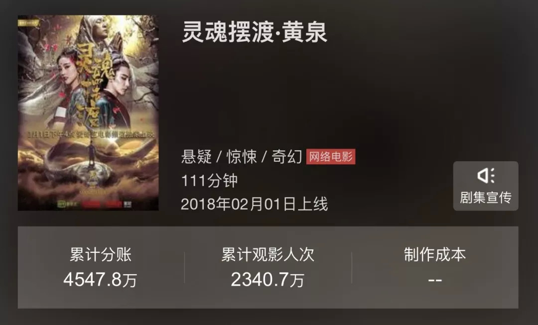 行业得到规范之后,作品数量上虽说对比往年下降了,但在质量上却有了明显的提升,2018年如《济公之神龙再现》(分账票房1962.7万)、《大蛇》(票房已过2000万)等优良作品都在这一时期后出现,其中《灵魂摆渡·黄泉》票房分账超过了4547.8万,刷新了行业的天花板。