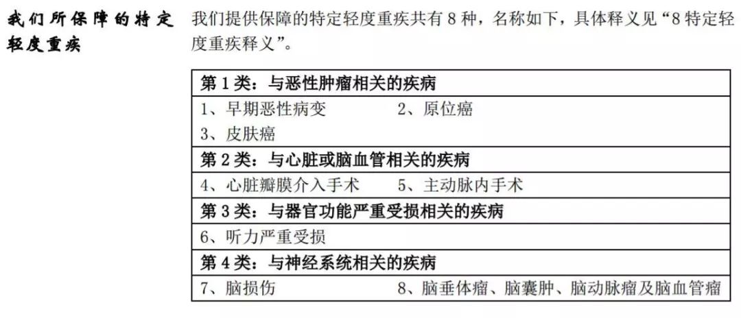 换句话说,每一项重疾病症,都有一项对应的轻症,比如恶性肿瘤的对应轻症是原位癌,冠状动脉搭桥术对应的轻症就是冠状动脉支架术。