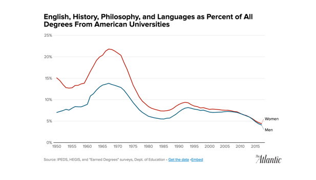 理论在美国的热络源自于1966年的“结构主义者之争”(The Structuralist Controversy),这是一场由理查德·麦克西(Richard Macksey)在约翰·霍普金斯大学发起的会议。霎时间,雅克·拉康、雅克·德里达和罗兰·巴特就在巴尔的摩掀起了一阵旋风。迅猛扩散的法国新思想引发了人们极大的热情,杰弗里·盖特·哈珀姆(Geoffrey Galt Harpham)后来回顾称,这一“充满危险与魅惑的气氛”为人文学科的招生带来了一波高潮,其增长达到了战后的峰值,学科领域也大为拓宽。(见图表1)