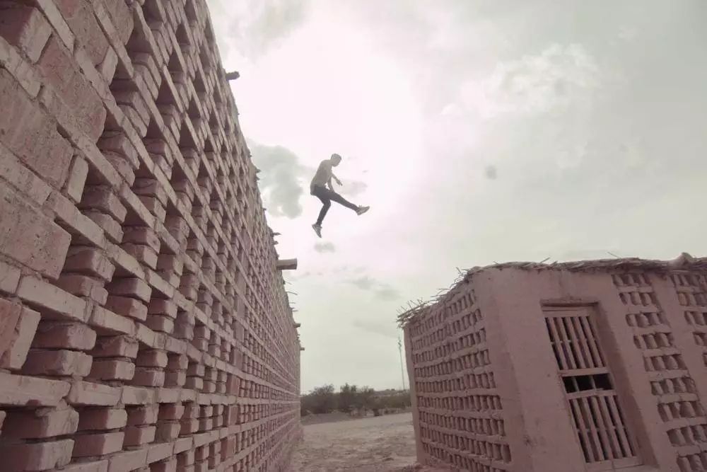 在吐鲁番鄯善县,我应该算是第一批开始玩跑酷的吧。我当时就模仿教学视频里的动作,从基础动作学起。比如金刚跳,就是过一个高的障碍时,脚不碰墙,只用双手撑着墙边,把身体从两条胳膊中间荡过去,像金刚走路一样。基础动作我觉得挺好练的,先在平地上联系,慢慢开始找矮的障碍,再之后跑的地形越来越高。我练了一年多就能上高楼了。