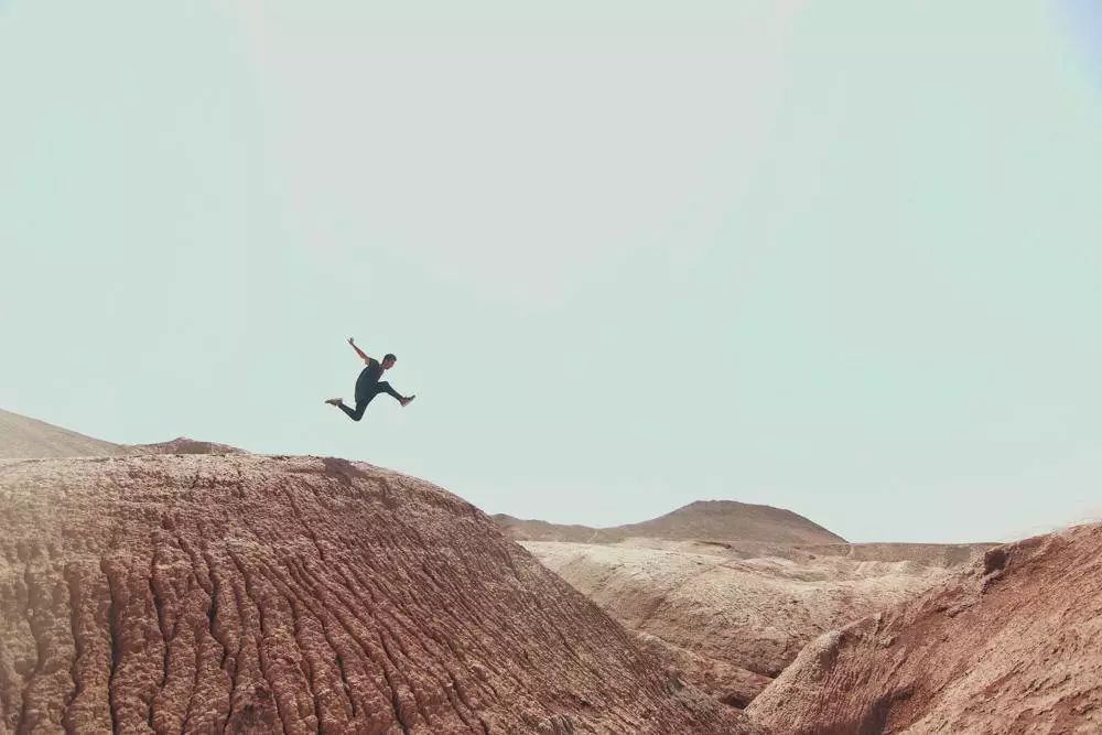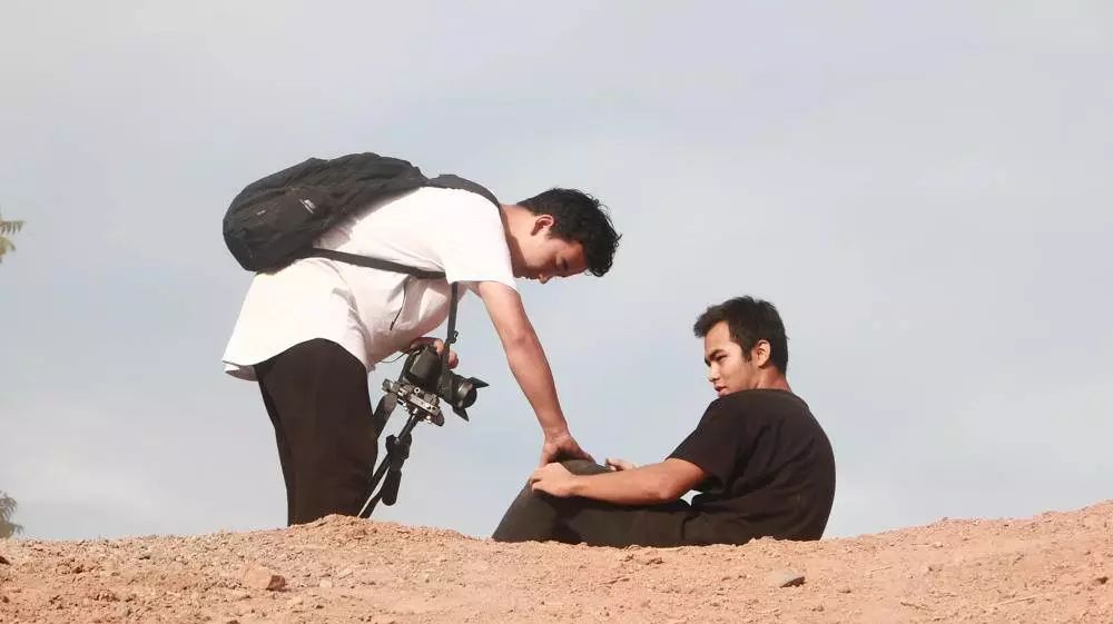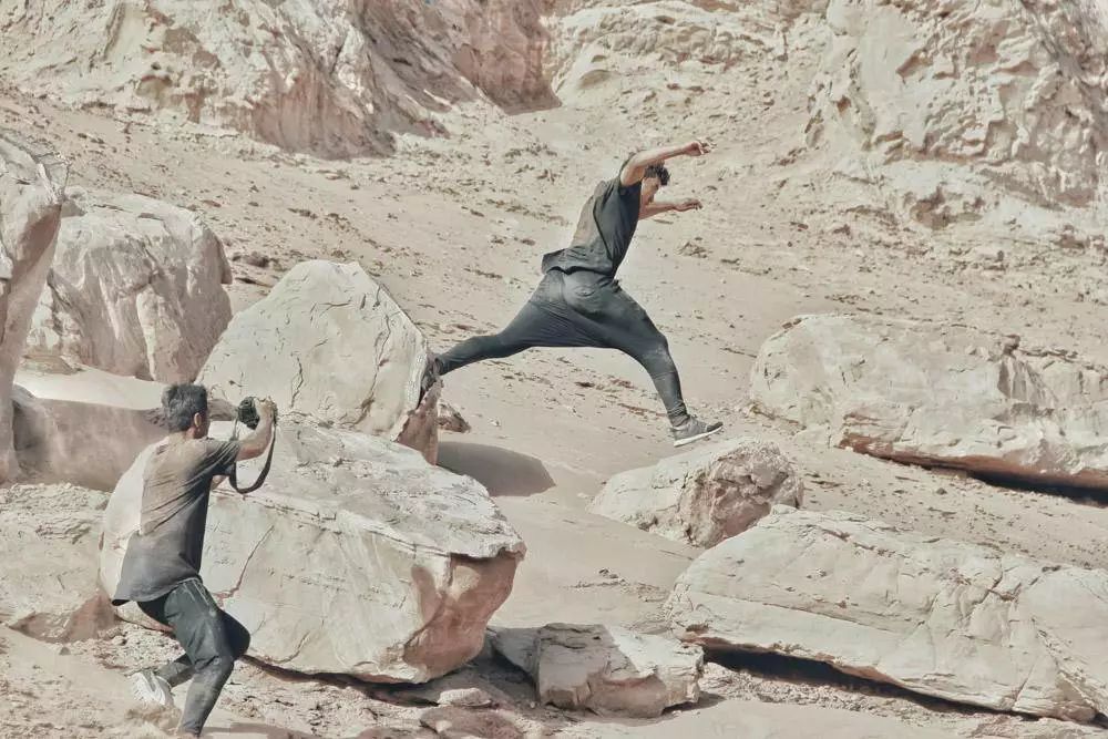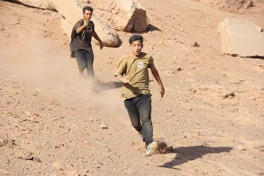 那是在高三暑假的七月,天气特别热。我们扛着一大堆器材和比器材还重的水爬上了山坡,山后头就是一片戈壁。七月的吐鲁番真是要命的节奏,戈壁滩上一滴水都没有,气温达到45度以上。我们先勘景,一起设计路线。我们每个人有不同擅长和适合的动作,哪个场景适合哪个动作,就由这个人设计路线。拍摄一个动作前,我会先找好角度,看从哪个角度拍视觉冲击力更大,然后定好三台机器的位置。一个人跑,三个人拍,一人用三脚架,一人用斯坦尼康(注:摄影稳定器),还一人手持。我们三个跑酷的人轮流出镜。
