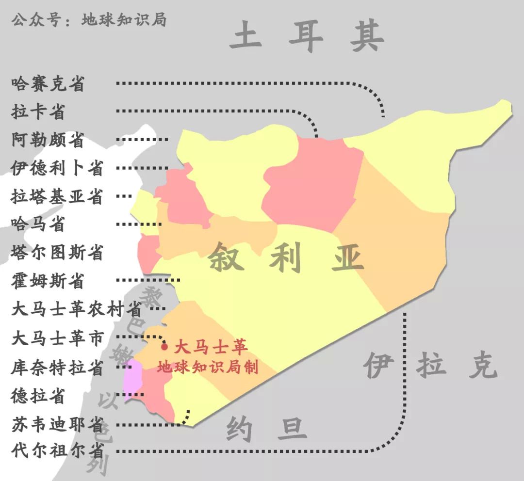 叙利亚全境分为14个主要地区,13个省+大马士革首都区,各省以主要城市命名,如阿勒颇之于阿勒颇省,国家主要城市集中在西部一线。