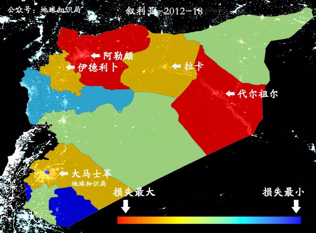 如果比较下损失,阿勒颇省夜间灯光区域面积由1201.49平方千米跌至183.00平方千米,仅剩原来的15.23%;代尔祖尔省夜间灯光区域面积由940.56平方千米跌至41.35平方千米,仅剩原来的4.3%。