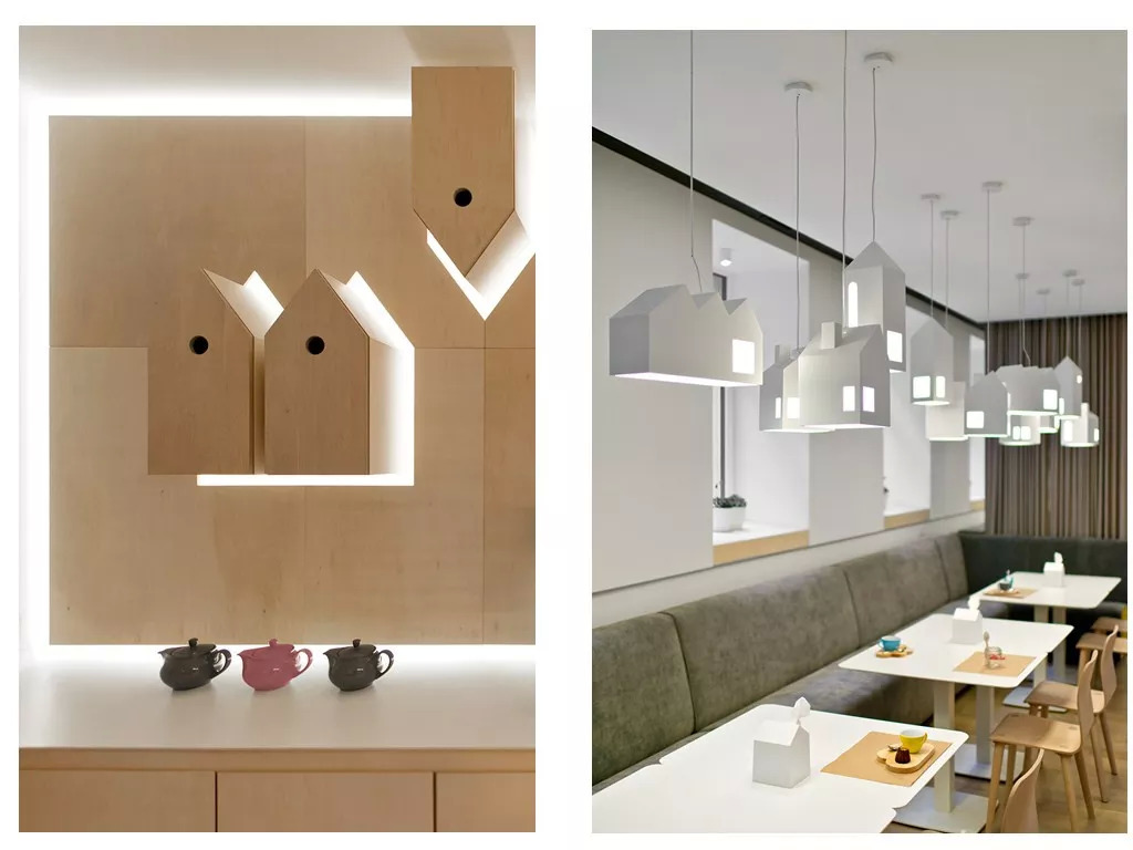 △维尔纽斯Kukumuku儿童剧院餐厅,灯饰和墙饰都是以房子为主题。图片来自马蹄网