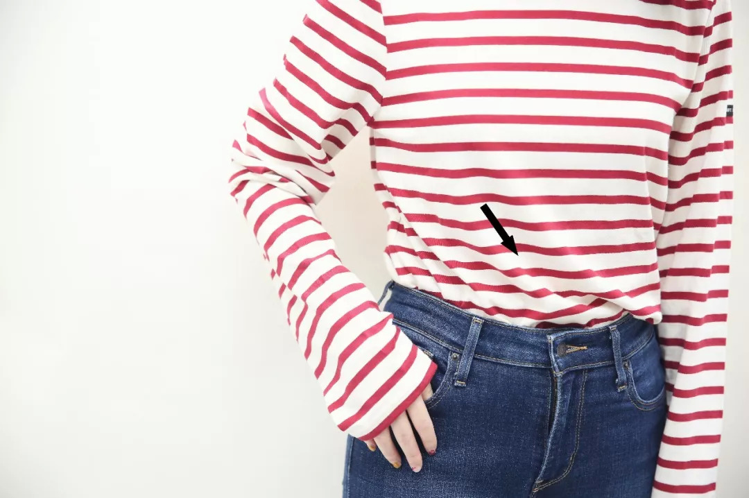 它的版型很神奇,是一种恰到好处的修身,同时又带点慵懒随意的调调。很多条纹衫在腰部会显小肚子,但这件不仅藏得非常好,还不会造成布料堆积。