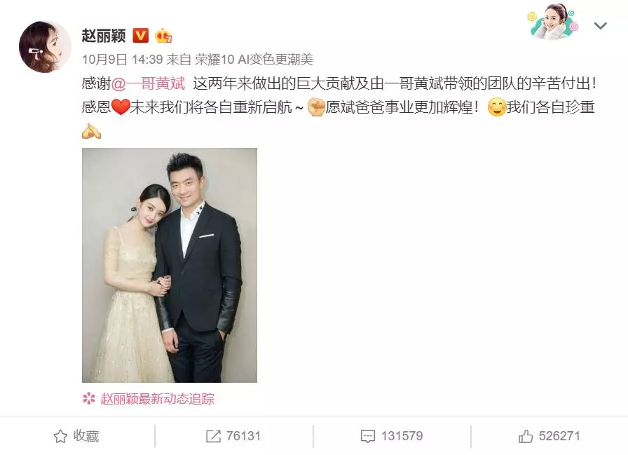 正当粉丝为赵丽颖的好资源高兴时,黄斌与赵丽颖两年合约期满,宣布和平解约。不久之后冯、赵二人直接发微博晒出结婚证。