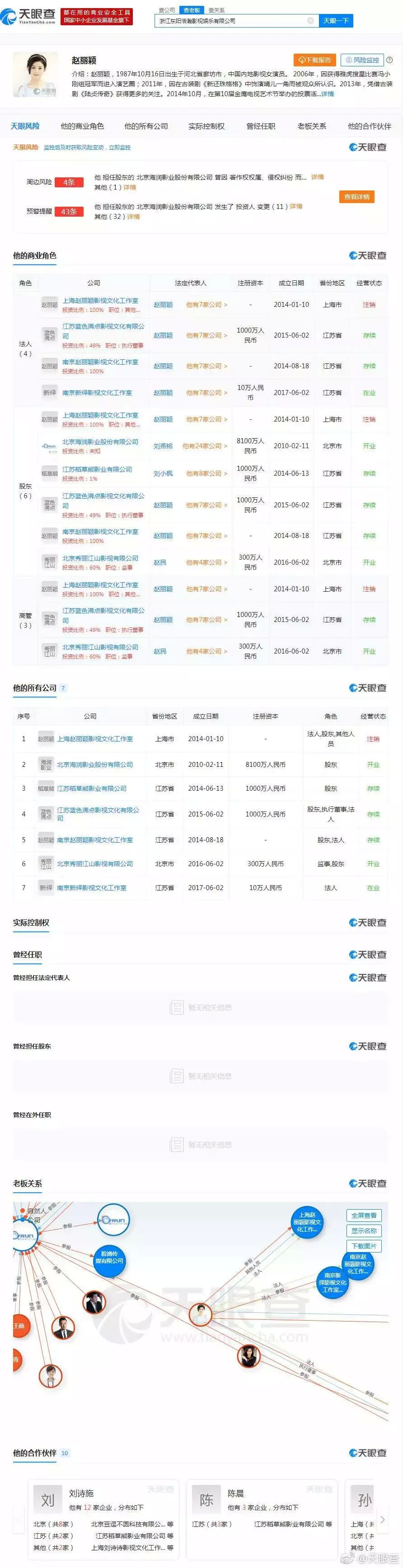 除了赚钱能力一级棒以外,赵丽颖名下还有众多公司。根据天眼查数据显示,赵丽颖还是4家企业的法人,8家企业的股东,2家企业的高管。