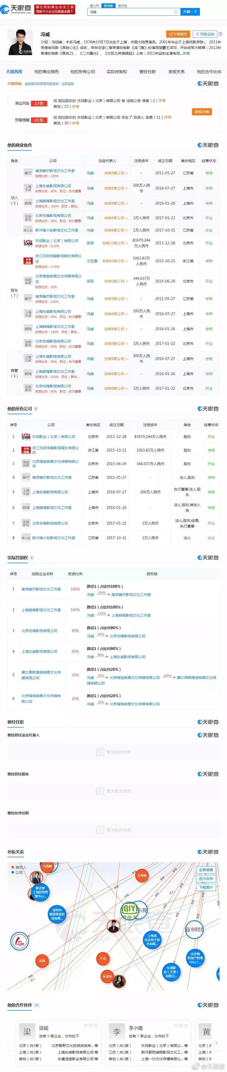 天眼查数据显示,冯绍峰名下有8家公司,目前在5家企业担任法人,同时还是乐视影业、东阳浩瀚等7家企业的股东。冯绍峰名下公司虽然没有投拍过什么爆款大剧,冯本人的人气和作品也不如赵丽颖,但作为乐视影业和东阳浩瀚的股东,加上传闻中富甲一方的家庭背景,冯绍峰身价不算低。