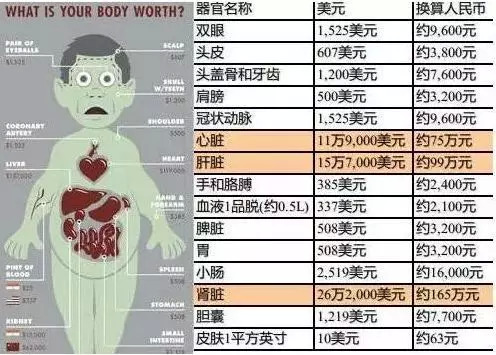 去年,美国Medical Transcription网站公布了一份美国黑市的人体器官交易价格图,上天赐予每个人的“财富”,很可能超乎你的想象。