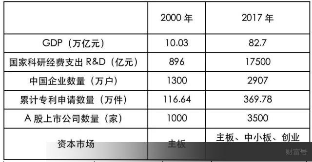 国内GDP增长8倍,国家创新创业环境优化,每年的R&D支出从896亿元增长到17500亿元,企业数量及专利数量翻倍,A股上市公司增长2倍以上,目前多层次资本市场框架已经由主板、中小板、创业板及新三板组成,相比彼时只有主板,且还未启动股权分置改革。