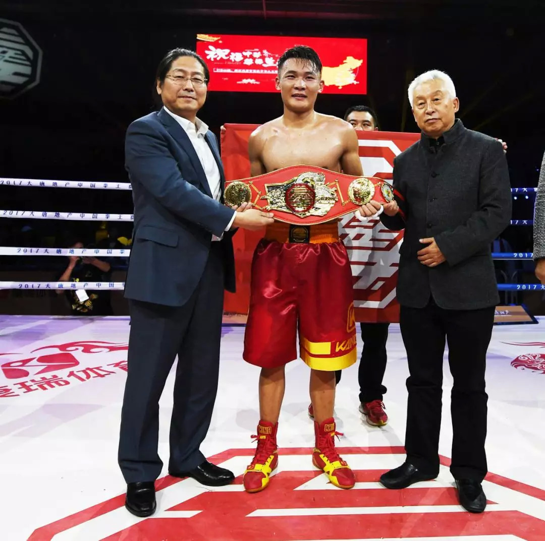 中国拳协主席张传良与吴迪董事长一同为王港颁发2017中国拳王赛第一条金腰带